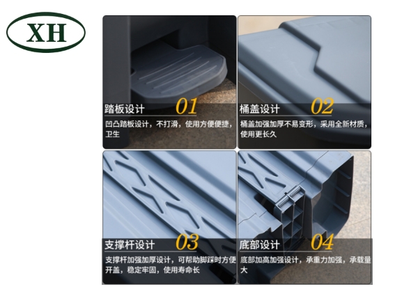產品介紹腳踩垃圾桶介紹1、密度高的高壓聚乙烯或聚丙稀原材料注塑加工生產制造,使用壽命長。2、要采用全新升級原材料,合理避免弱酸性、···